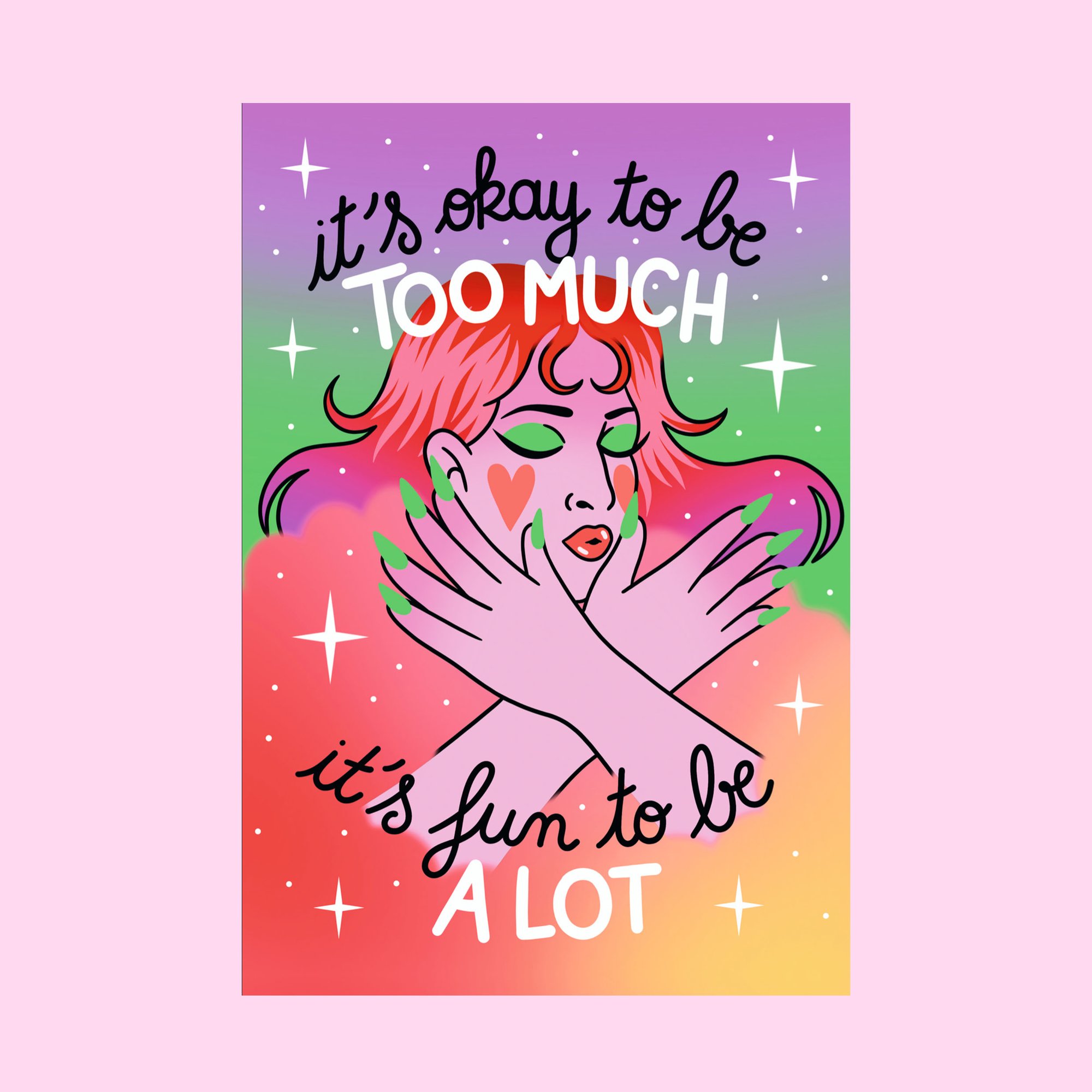 • Carte postale • "It's okay to be too much, it's fun to be a lot" • Impression papier 300g • Envoyé à plat dans une petite enveloppe